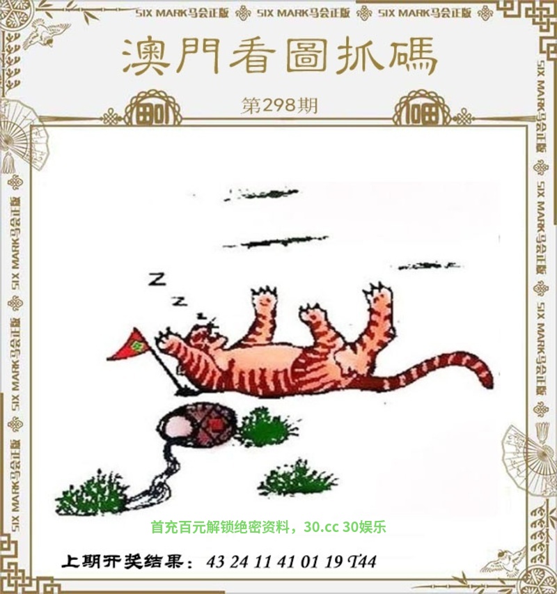 | 298期:【解抓码图】【开羊23】 破解图文:图中有一只躺着睡觉的老虎,它四脚朝天,旁边有一面小旗子,旁边还有几丛草。 综合九肖:虎狗马蛇鼠鸡兔龙羊 |