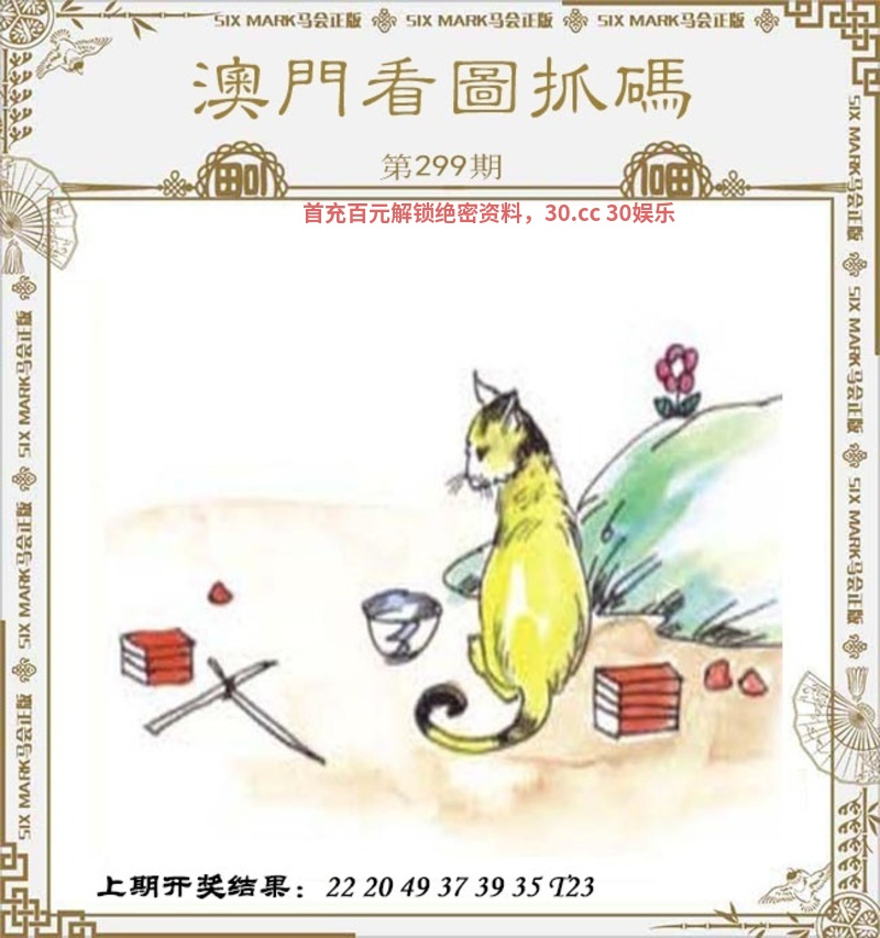 | 299期:【解抓码图】【开蛇49】 破解图文:图中有一只黄色的猫坐在地上,背对着观众,猫的旁边有一个碗和一双筷子,以及两堆红色的书。 综合九肖:虎兔狗鸡猪马蛇龙鼠 综合七肖:虎兔狗鸡猪马蛇 |